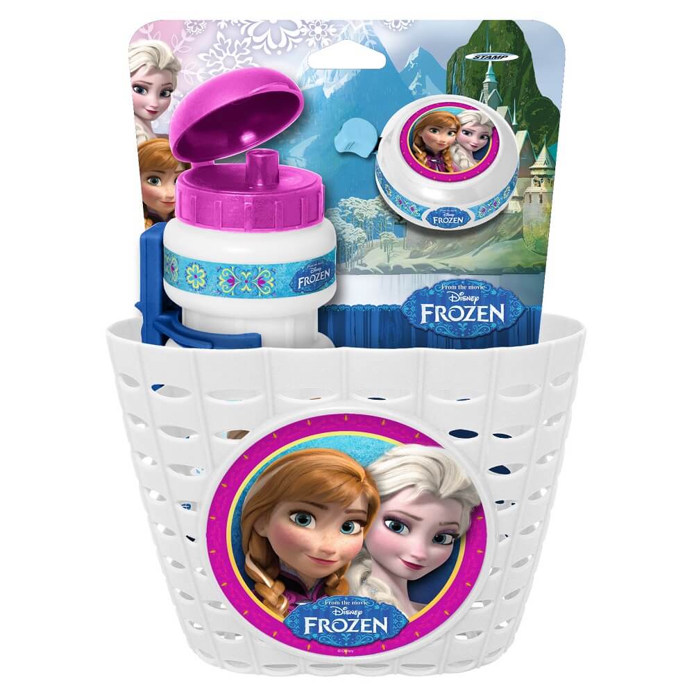 Cyklistická sada Frozen je sada košíka, cyklo fľaše a zvončeka s atraktívnymi rozprávkovými motívmi. Jedná sa teda o nevyhnutnú súčasť výbavy detského bicykla. Košík a fľaša sú vyrobené z ľahkého, ale odolného plastu. Zvonček je vyrobený v kombinácii plastu a kovu. Vďaka jeho univerzálnej objímke je ľahké ho jednoducho uchytiť na všetky typy riadidiel. Štýlový motív Ľadového kráľovstva z tejto sady urobí obľúbený doplnok na bicykel a rozžiari oči Vašej malej cyklo princeznej.