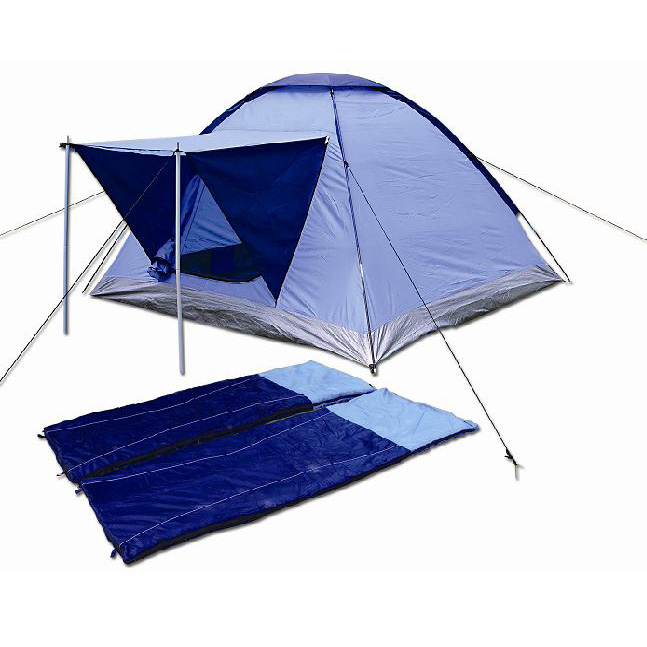 - univerzálna outdoorová súprava zložená zo stanu pre 3 osoby, 2 spacích vakov a 2 alu podložiek