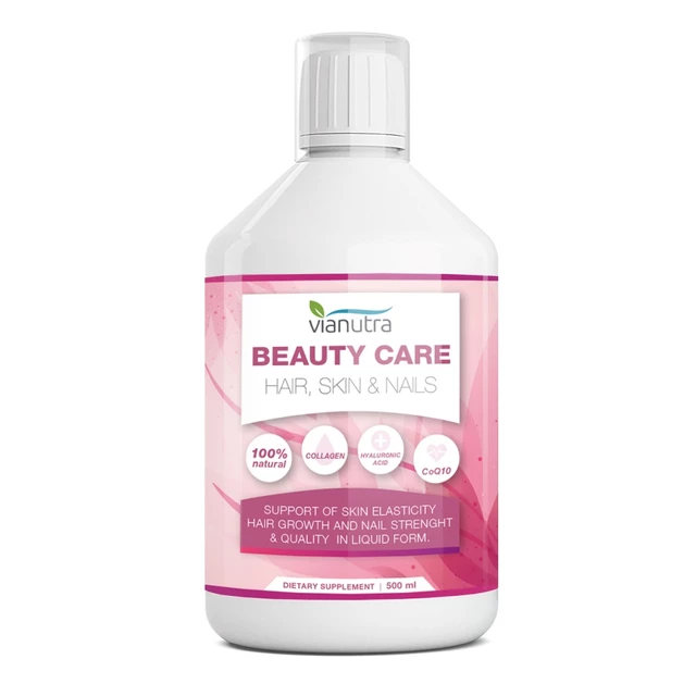 Doplnok stravy Vianutra Beauty Care 500 ml je komplex prírodných látok nielen na zlepšenie krásy, ale aj zdravia vlasov, pokožky a nechtov. Vzájomná súhra vitamínov a minerálov umocnená účinkom síry (z MSM) a výťažkami z rastlín pôsobí stimulačne na korienky vlasov, pokožku aj nechtové lôžka. Unikátne zloženie prípravku pomáha tvorbe kolagénu i keratínu. Dodávaný je v tekutej forme, ktorá zaručuje lepšie vstrebávanie.