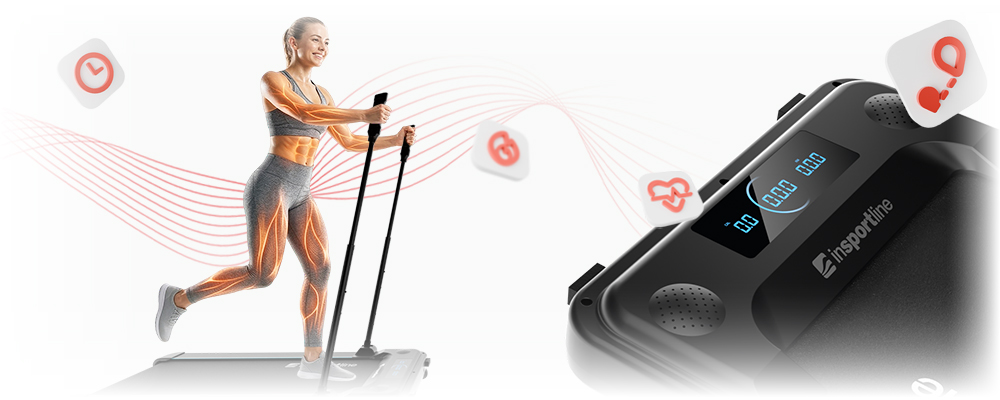 Ovládanie je maximálne jednoduché – na pravej rukoväti nájdete štyri tlačidlá (štart, stop a nastavenie rýchlosti), vďaka ktorým môžete plynule regulovať tempo v rozmedzí 1 – 8 km/h. Na LED displeji prehľadne sledujete čas, vzdialenosť, rýchlosť aj spálené kalórie. K dispozícii je tiež Bluetooth audio pripojenie a integrované reproduktory na prehrávanie hudby počas tréningu.