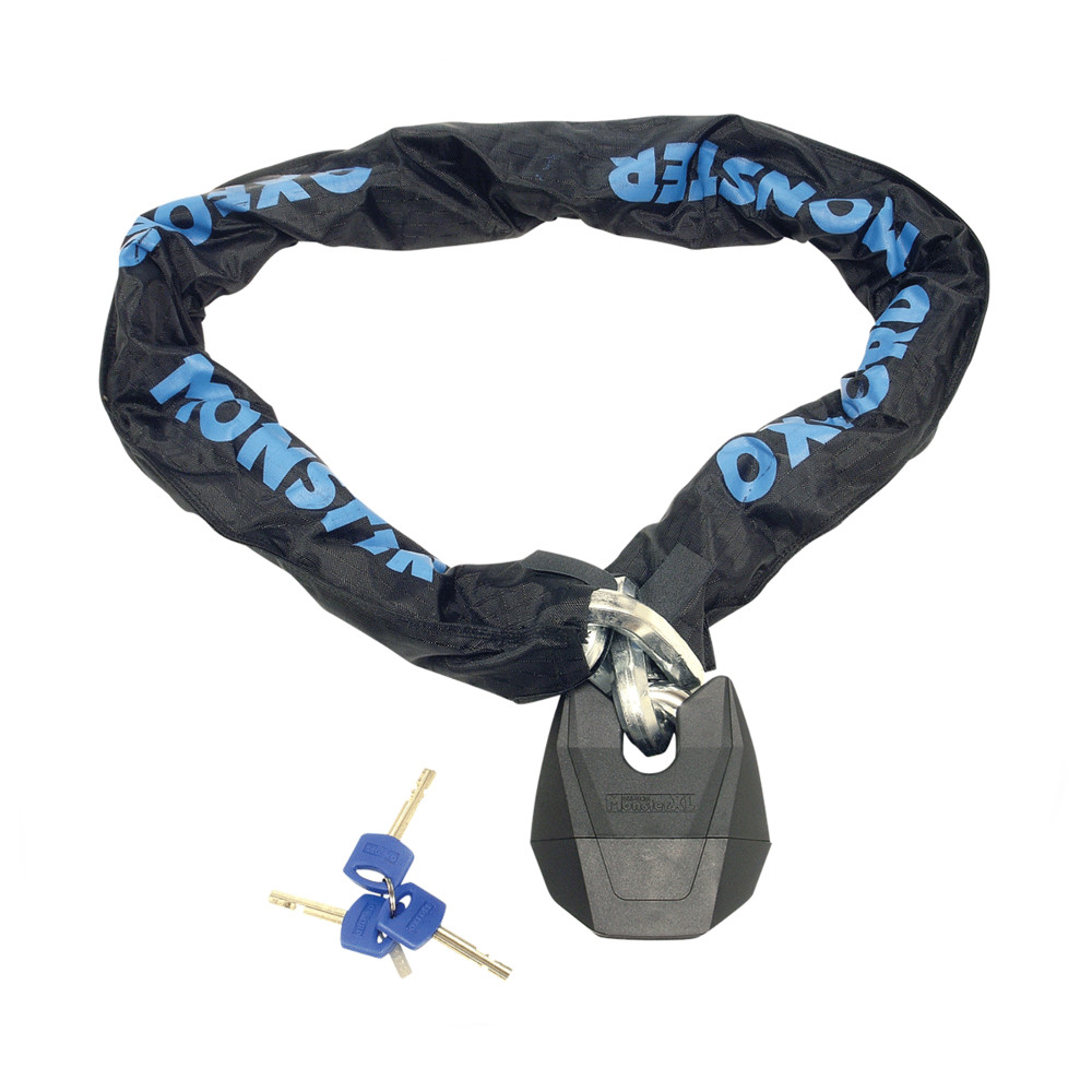 Oxford Monster XL 120 cm je jeden z najrobustnejších reťazových zámkov Oxford hrubý 14,5 mm, ktorý spoľahlivo zabezpečí nielen vašu motorku! Silná skoba s priemerom 16 mm, je vybavená mechanizmom, ktorý znemožňuje zámok vypáčiť. Reťaz je vyrobená z tvrdenej ocele, ktorá je pokrytá textilným plášťom, ktorý ju chráni pred prachom a poškodením. Súčasťou balenia je súprava troch kľúčov pre bezpečné odomknutie.